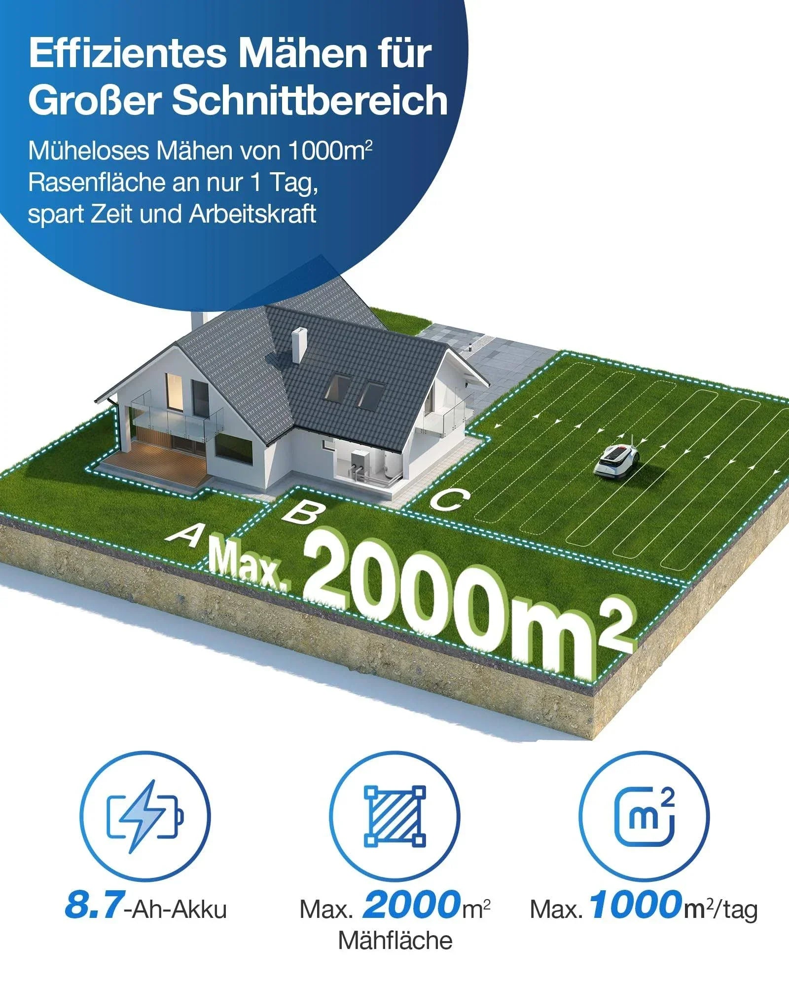 【All-in-One Rasenmäher】GOAT G1-2000 mit 8,7AH Akku ist eine Komplettlösung für große Gärten mit einer effizienten Schnittleistung von bis zu 2000m2 und bis zu 1000m2 pro Tag. Zusätzlich ist der G1-2000 mit einer robusten Garage ausgestattet, die deine GOAT schützt und eine lange Lebensdauer sowie ein elegantes Design bietet. Mit dem eingebauten Auto-Verbindungsmodul kann der G1-2000 jederzeit ein WiFi-Signal empfangen, um ein Schneideerlebnis aus einer Hand zu bieten. 【Drahtlose Begrenzungseinstellung】Verabschiede dich von der traditionellen manuellen Begrenzungsinstallation mit der drahtlosen Begrenzungseinstellung. Ersetze die elektronischen Drähte durch ein Bakensignal und vervollständige die drahtlose Begrenzungseinstellung für einen Standardgarten mit einem Klick auf der App, die die Effizienz der Begrenzungseinstellung mit einer stabileren Signalübertragung und einer stärkeren Entstörf.