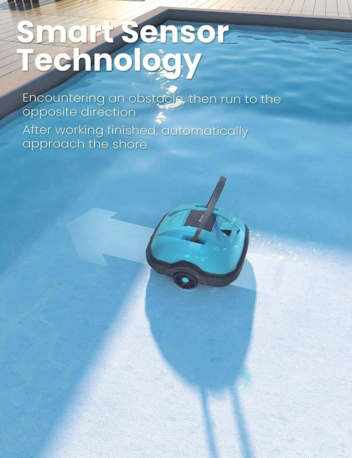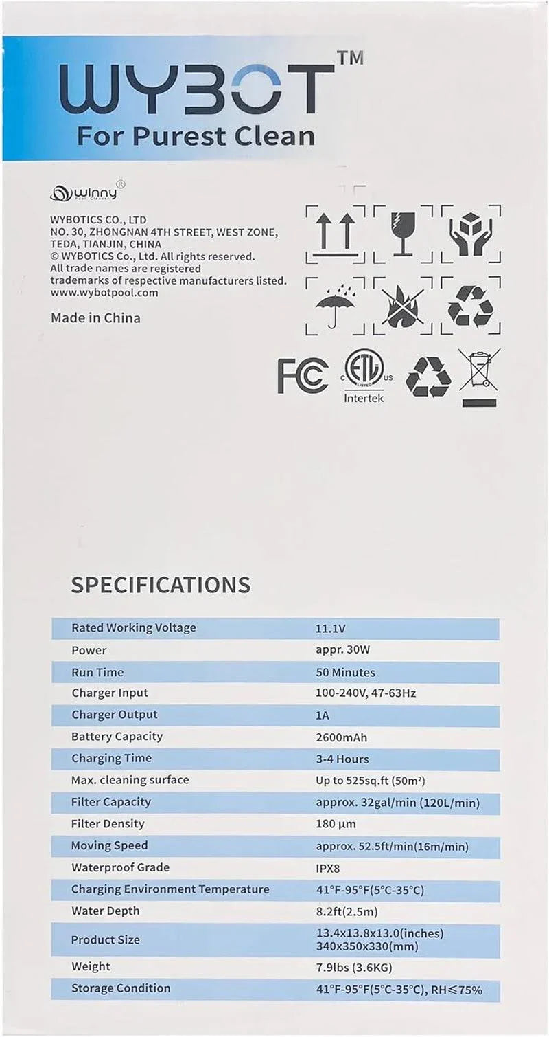 Poolroboter Kabellos: Bitte kaufen Sie beim Verkäufer für Amazon, um die WYBOT-Markengarantie zu erhalten. Der WYBOT Robotic Pool Cleaner ist mit einer langlebigen Batterie ausgestattet, die 50-60 Minuten lang ununterbrochen arbeiten kann und auch das Risiko eines versehentlichen Stromschlags durch Seile eliminiert. Vollautomatischer Schwimmbadreiniger können Sie jede Form von Pooloberfläche auf Knopfdruck schrubben und Ihren Pool glänzend halten. Effiziente Reinigung: Roboter-Poolstaubsauger reinigen Ihren Pool automatisch und effizient. Es verfügt über einen Zweiradantrieb, zwei Bodenabstreifer, einen 180-μm-Feinfilter und die Saugkraft ist stark genug, um jede Ecke des Pools zu erreichen, Staub, Sand, kleine Blätter usw. leicht aufzusaugen und herauszufiltern Intelligente Navigationstechnik: Wenn er auf eine Wand trifft, zieht sich der Poolroboter automatisch zurück. Wenn die Batterie schwach ist, nähert sich der Roboter automatisch dem Ufer. Die Filterscheibe entfernt einfach die Kappe und spült mit einem Schlauch Einfache Handhabung: Der kompakte Akku-Staubsauger wiegt nur 3,6 kg und lässt sich mit einer Hand bewegen und mit einem Haken aus dem Pool ziehen. Paket wird mit Haken zur Befestigung an Standard-Poolstangen geliefert (nicht im Lieferumfang enthalten) Kompatible Pooltypen: Ideal für oberirdische Pools und Tiefgaragen mit flachem Boden (maximale Neigung < 15°). Geeignet für alle Beschichtungen (PVC, Fliesen, Vinyl oder gespritzt) und Formen (rund, rechteckig oder oval). Für Schwimmbäder unter 50 Quadratmetern können Roboter den gesamten Pool in 50 Minuten reinigen und einen hervorragenden Service für jeden Bereich der Poolreinigung bieten. Bitte kaufen Sie beim Verkäufer für Amazon, um die WYBOT-Markengarantie zu erhalten. Produktinformation Der Richtige Helfer, Damit Ihr Pool Funkelt! Keine Sorge wegen Kabelsalat Kabellose Reinigung, Hände frei 1 kraftvolle Leistung 2 Verschiedene Materialien 3 Unterstützte Typen Hervorragende Hindernisfahrfähigkeit Die neu aufgerüsteten Seitenräder haben ein übergroßes Design, das unebene Straßen sicher passieren kann. Ladestatus Ladelicht: Rot für "Laden", Grün für "beendet" Ein vollständiger Ladezyklus dauert nur 3-4 Stunden und bietet 50-60 Minuten kabellose Reinigungszeit. Einfach zu Verwenden Schalten Sie den Strom ein, drücken Sie die Taste, um den Poolreiniger einzuschalten, und stellen Sie den gesamten Roboterreiniger unter Wasser. Einfach zu Säubern Öffnen Sie die Verriegelung, entfernen Sie die obere Abdeckung und nehmen Sie den Filter heraus. Unter fließendem Wasser gut abspülen. Tipps zum Motorschutz Wenn der Roboter erkennt, dass er sich nicht im Wasser befindet, hört er automatisch auf zu laufen und gibt zur Erinnerung den Ton ''Bi Bi'' von sich.