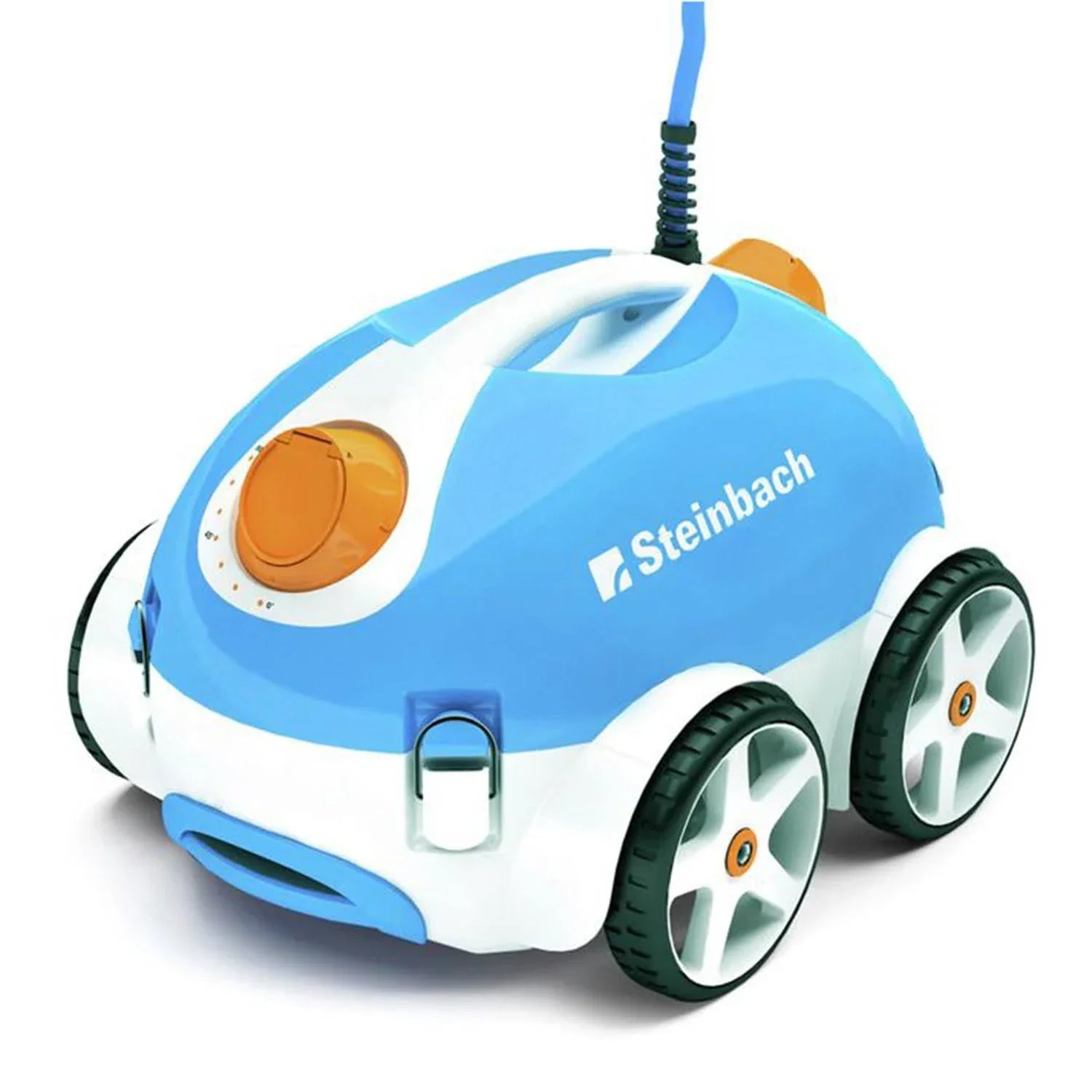 Der Steinbach Bodensauger Speedcleaner Poolrunner ist ein vollautomatischer, elektrischer Bodensauger zur Reinigung von allen Pools mit flachem Boden. Ein Anschluss an den Skimmer bzw. an ein externes Filtersystem ist nicht notwendig. Der Reiniger verfügt über einen 24 V Gleichspannungsmotor mit Jetantrieb zur alleinigen Reinigung von Bodenflächen. Die Steuerung erfolgt über jeweils eine Düse auf der Vorder- bzw. Rückseite. Das eingebaute Filtersystem ist mit einer Hochleistungspumpe von 15.000 l/h, 0,004 166 666 m³/s, ausgestattet. Das Verbindungskabel zwischen Steuergerät und Bodensauger hat eine Länge von 12 m. Der Speedcleaner Poolrunner kann für Pools bis zu einer Größe von 8 m x 4 m eingesetzt werden.