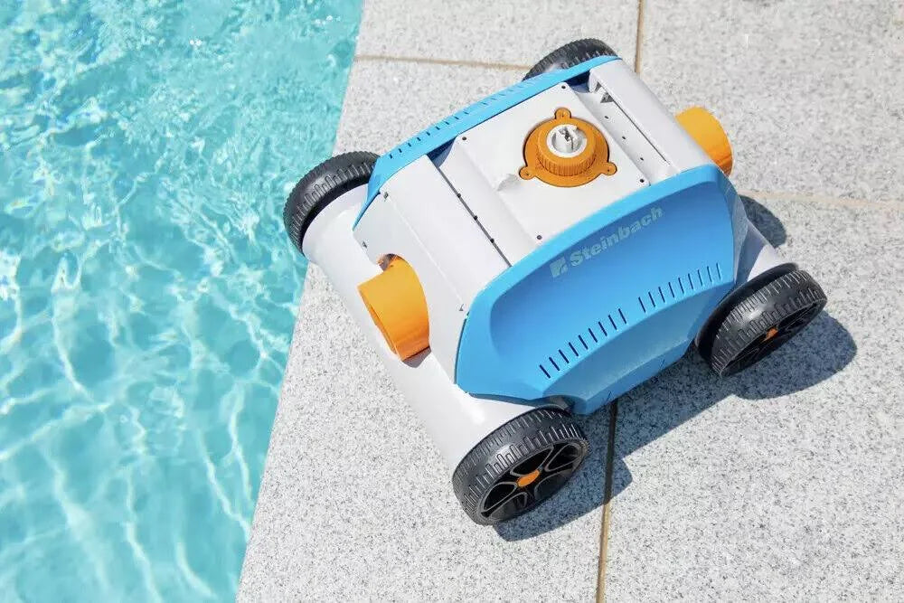 Hallo, hier wird ein Steinbach Poolrunner Battery ist ein effizienter Poolroboter, der u00FCber Wasserjet-Du00FCsen gesteuert wird, wegen einer Neuanschaffung angeboten.Das Geru00E4t ist ein Akkugeru00E4t, und hat uns in den letzten beiden Saisons sehr gute Dienste geleistet. Es wird einfach in den gefu00FCllten Pool gesetzt und fu00FChrt die Reinigung selbstu00E4ndig durch. Nach circa 120 Minuten ist die Batterie alle, und der Roboter bleibt in der Nu00E4he der Poolwand stehen. Mithilfe des Seils kann der Poolroboter aus dem Pool entnommen werden. Die Reinigung ist kinderleicht, Sieb entnehmen, abspu00FClen, fertig.